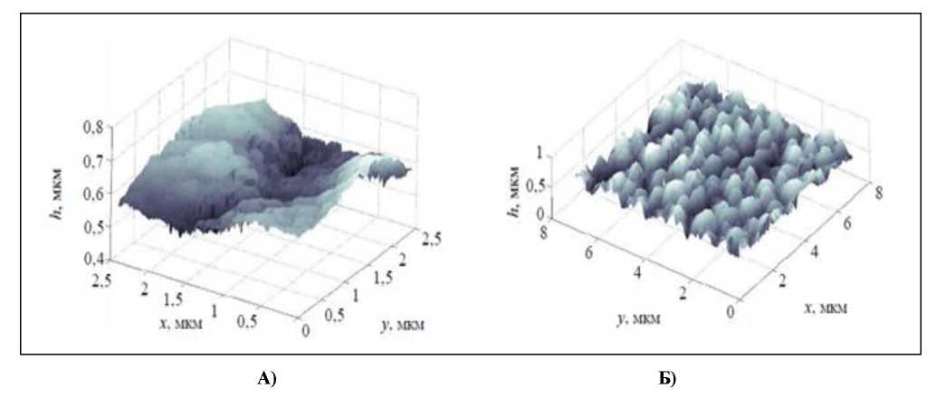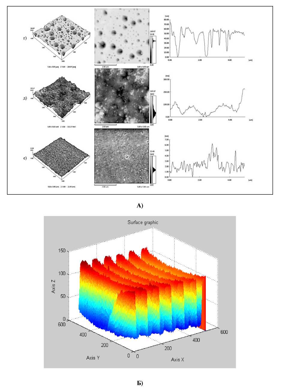 Рис. 2. А) Снимки атомно-силовой микроскопии топологий и графики глубинного профиля мембран для значительных концентраций ПОСС (масс. %). Б) Двумерное изображение периодической эталонной мембраны с матрицей данных 512×512 пикселей