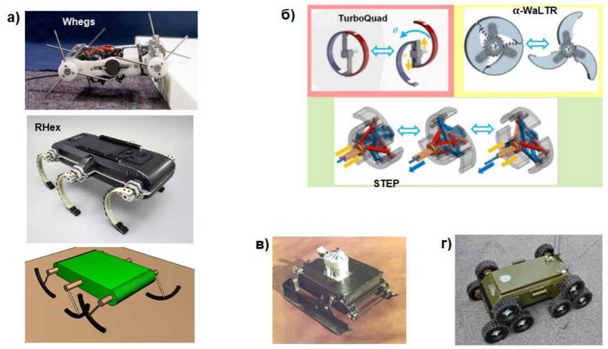 Среди псевдошагающих роботов возможно выделить: группу с однозвенным движителем-кривошипом (WHegs, RHex [1], модель робота, разработанная Федоровым, Дьяковым и Евсеевым [2]); группу роботов с движителем-трансформером (TurboQuad, α-WaLTR, STEP [1]); роботы с «лыжей», соединяющей концы двух кривошипов (ПрОП-М [3]); роботов с колесом на конце кривошипа (исследуются в этой статье). Выделенные группы представлены на рис. 1.