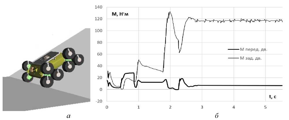 Рис. 5. Движение на подъем 30°: а – моделирование подъема; б – моменты на входе в бортовые редукторы движителей левого борта робота