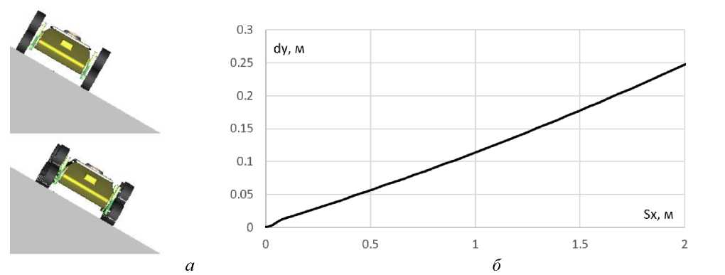 Рис. 10. Движение на косогоре: а – моделирование движения на косогоре; б – зависимость бокового смещения робота от пройденного им пути