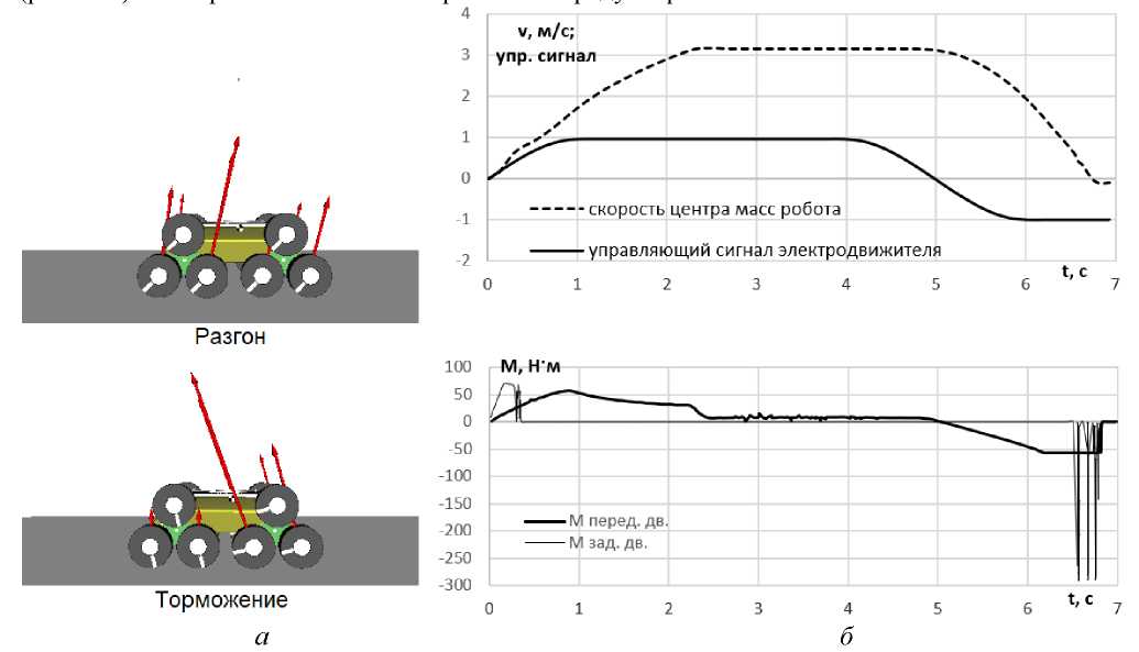 Рис. 11. Разгон-торможение: а – векторы сил, действующие на шестерни колес при моделировании; б – изменение скорости робота и моментов на входе в бортовые редукторы движителей при изменении закона управления