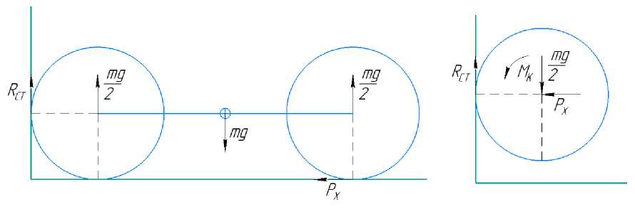Рис. 1. Расчетная схема при общепринятом решении: m – масса машины; PX – продольная реакция взаимодействия с опорным основанием колес задней оси машины; RСТ – продольная реакция взаимодействия со стеной колес передней оси машины; MК – крутящий момент, приложенный к оси машины