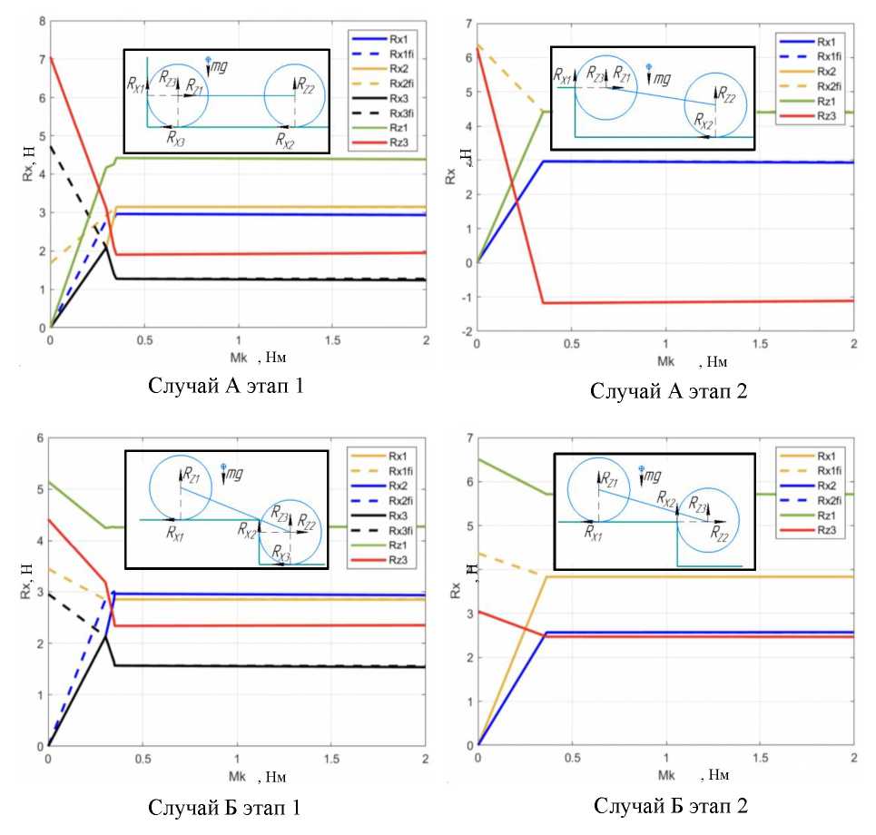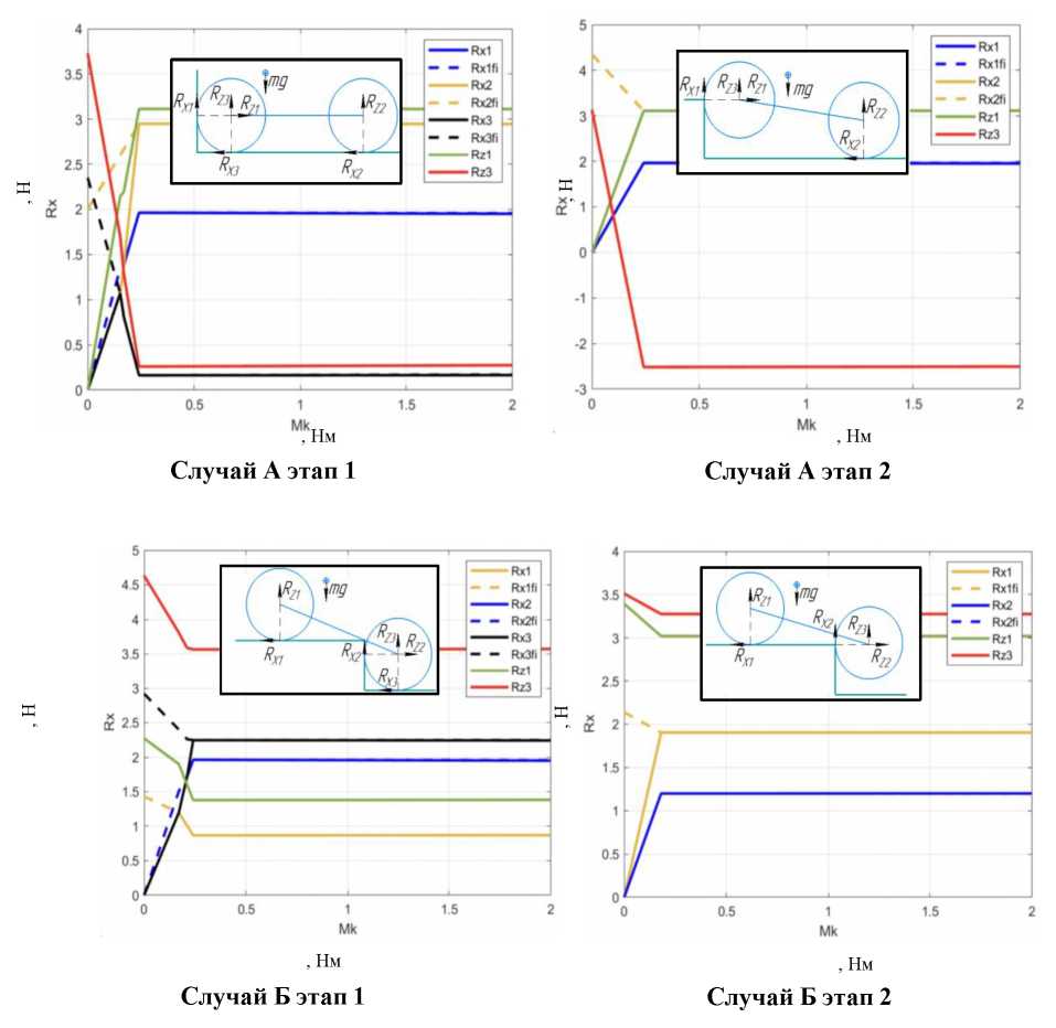 В первом случае (случай А на рис. 2) условием подъема является неравенство: RX1 > RZ3, условием не опрокидывания является неравенство: RZ1 > 0. RZ3 – суммарная вертикальная сила на оси, возможность подъема которой проверяется, находится из равенства нулю крутящих моментов относительно противоположной оси.