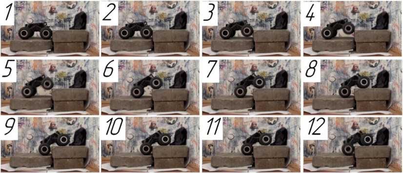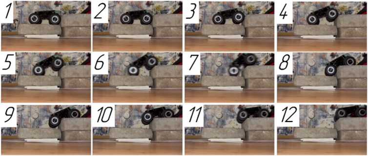 Натурный эксперимент с модифицированным образцом (рис. 11) подтвердил аналитическое решение – возможно обеспечить преодоление преграды, представленной на рис. 7, при этом опрокидывания образца не происходит.