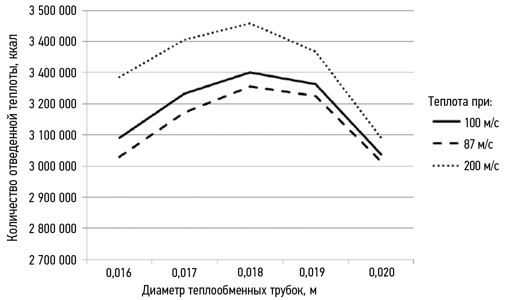 Рис. 7. Количество отведенной теплоты при разных скоростях пара, ккал.