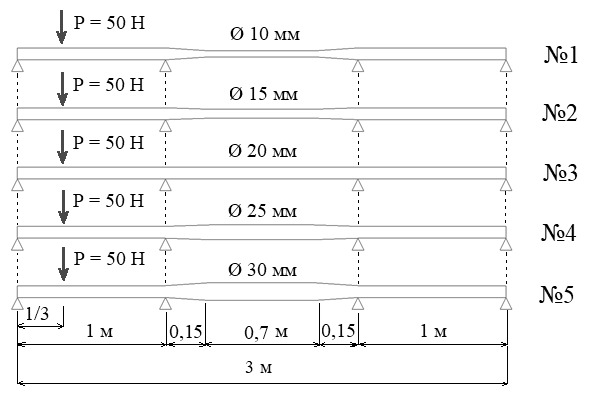 Все трубопроводы длинной 3 м состоят из равных пролётов по одному метру. На левом и правом пролётах диаметр всех трубопроводов равен 20 мм. В срединном пролёте на отрезке величиной 0,7 м трубопроводы имеют разный диаметр — 10 мм, 15 мм, 20 мм, 25 мм, 30 мм (рис. 1), он находится на расстоянии 0,15 м от опор.