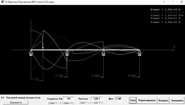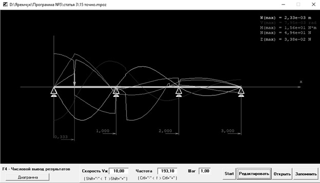 В [8, 9] были выведены формулы для парциальных откликов (ПО) и парциальных параметров (ПП) для второго и четвертого слагаемых из (2), а в [10] — для третьего слагаемого, в результате чего удалось избавиться от выполнения последовательных приближений. Выражения для ПО и ПП представляют собой математическую модель задачи, полученную методом парциальных откликов в его дискретном варианте [5, 6, 11]. Для полученной математической была разработана усовершенствованная программа расчёта параметров вибрации трубопровода [10], учитывающая автоматически влияние всех вышеуказанных факторов.