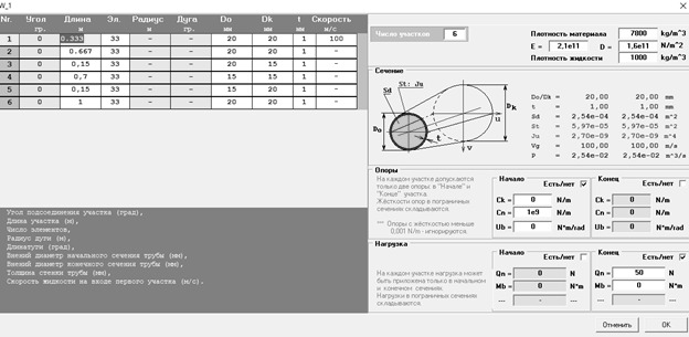 Расчёт проводился в программе «трубопровод-2», которая позволяет вычислять параметры вибрации в непризматическом прямолинейном многоопорном трубопроводе.