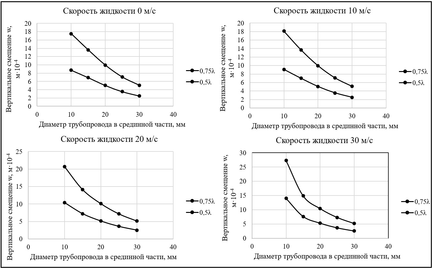 По полученным значениям, представленным в таблицах 6, 7 были построены графики зависимости вертикальных смещений от диаметра сечения трубопровода в срединной части — 10, 15, 20, 25, 30 мм, при различных скоростях движения жидкости — 0, 10, 20, 30 м/с (рис. 6).