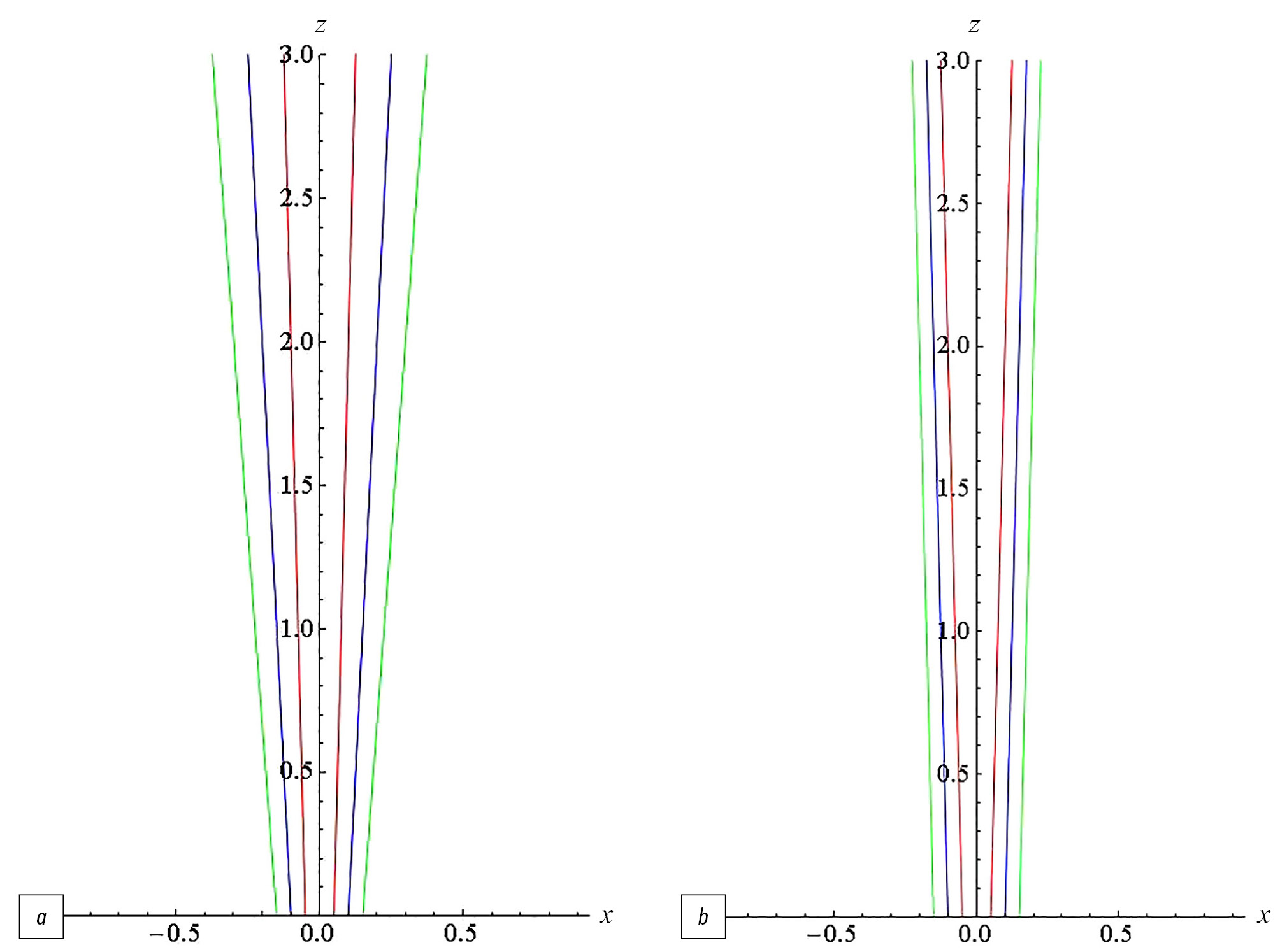 Рис. 2. Траектории частиц порошка, вылетающих из трубочки: a — разные начальные значения поперечной компоненты и соответствующие скорости; b — разные начальные значения поперечной компоненты и одинаковые начальные скорости.
