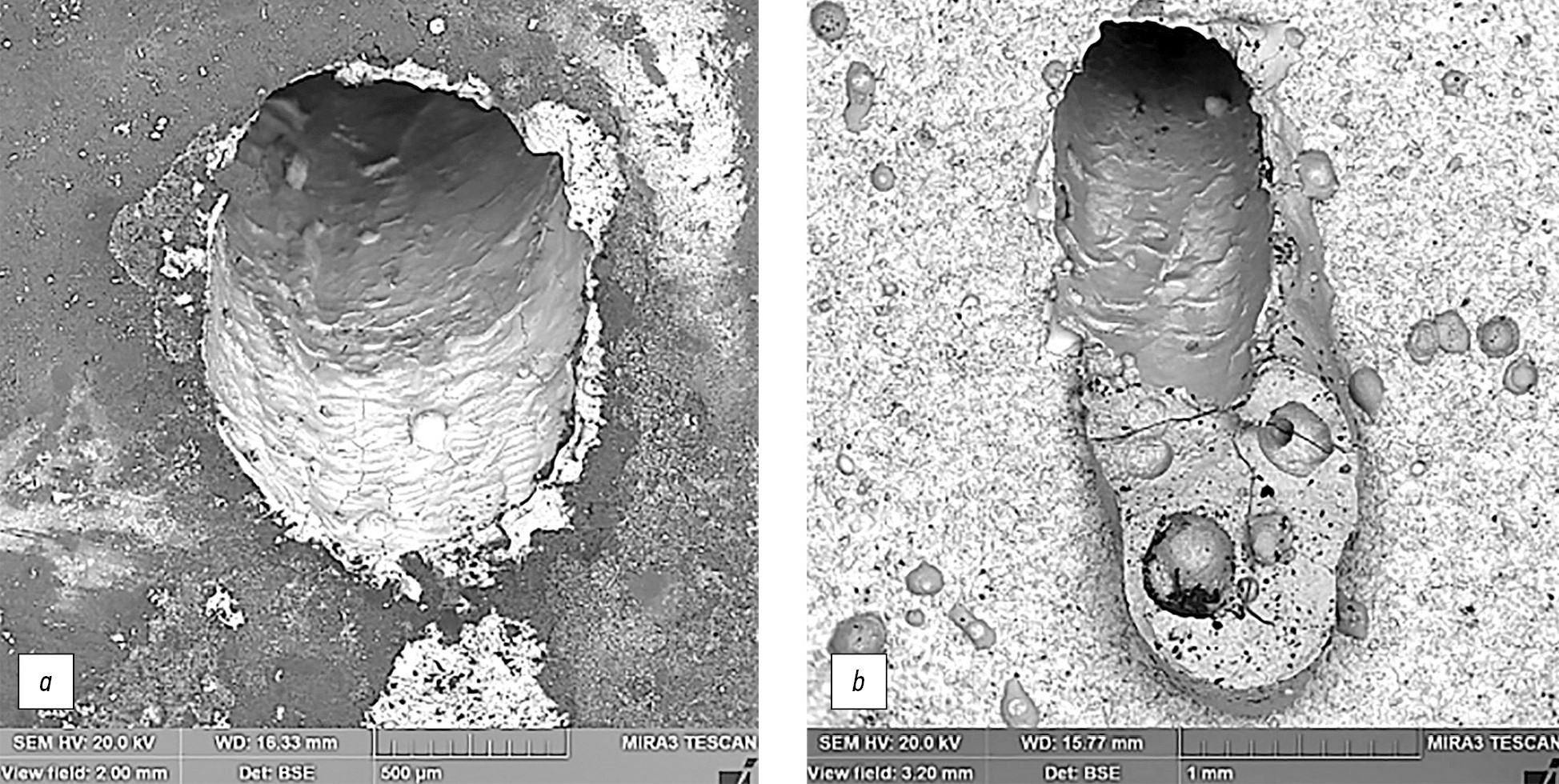 Осмотр поверхности образцов, проведенный на электронном микроскопе TESCAN MIRA3 LMH, показал, что сколов термозащитного покрытия вблизи отверстий не имеется. На поверхности образцов со стороны выхода лазерного излучения, преимущественно на образце без защитной пасты с нитридом бора, вокруг отверстий имеются выплески и наплывы.