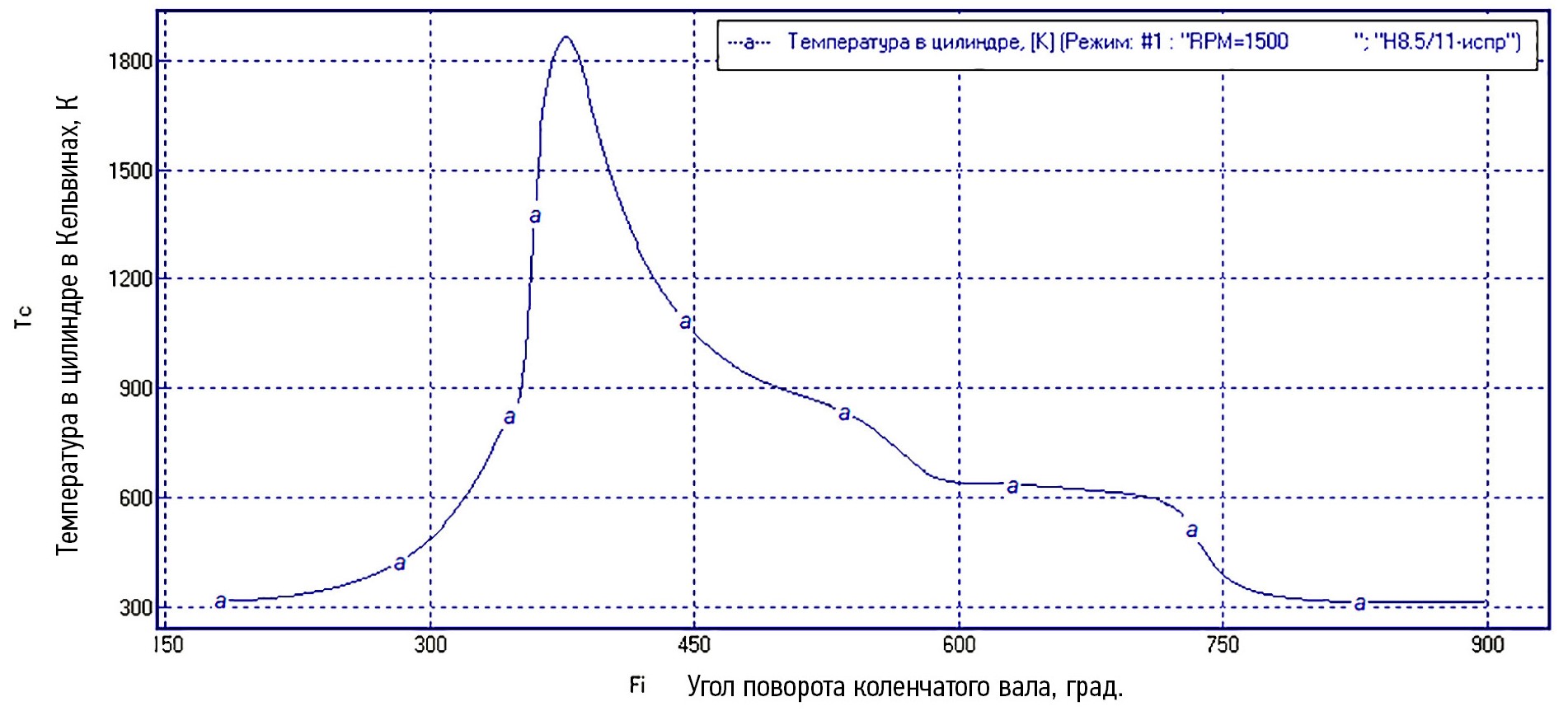Рис. 2. Температура в цилиндре судового малоразмерного двигателя 4Ч-8,5/11 в кельвинах (К) в зависимости от поворота коленчатого вала в градусах, полученная в программе Дизель РК.
