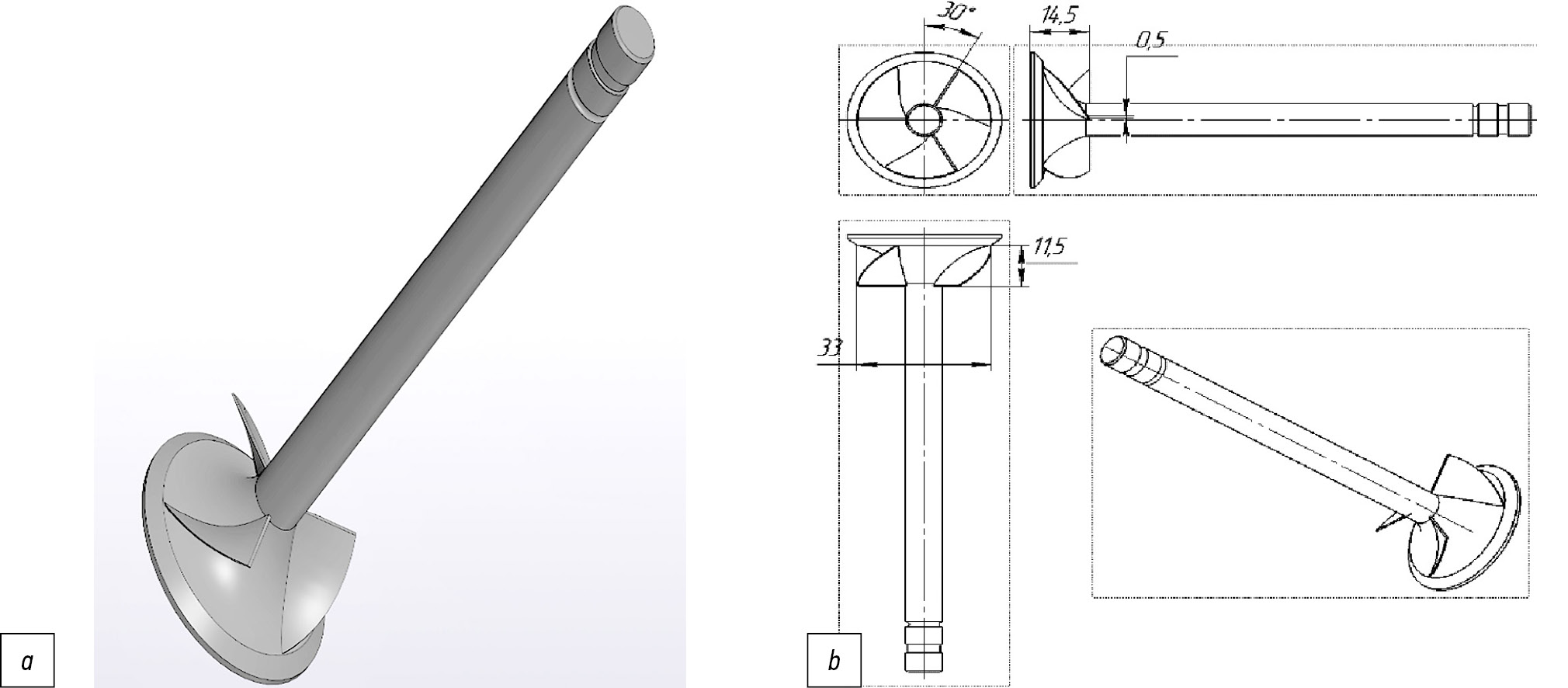 Рис. 1. Общий вид исследуемого клапана судового малоразмерного двигателя Ч8,5/11: а — представленный в 3D модели; b — основные размеры клапана [8].