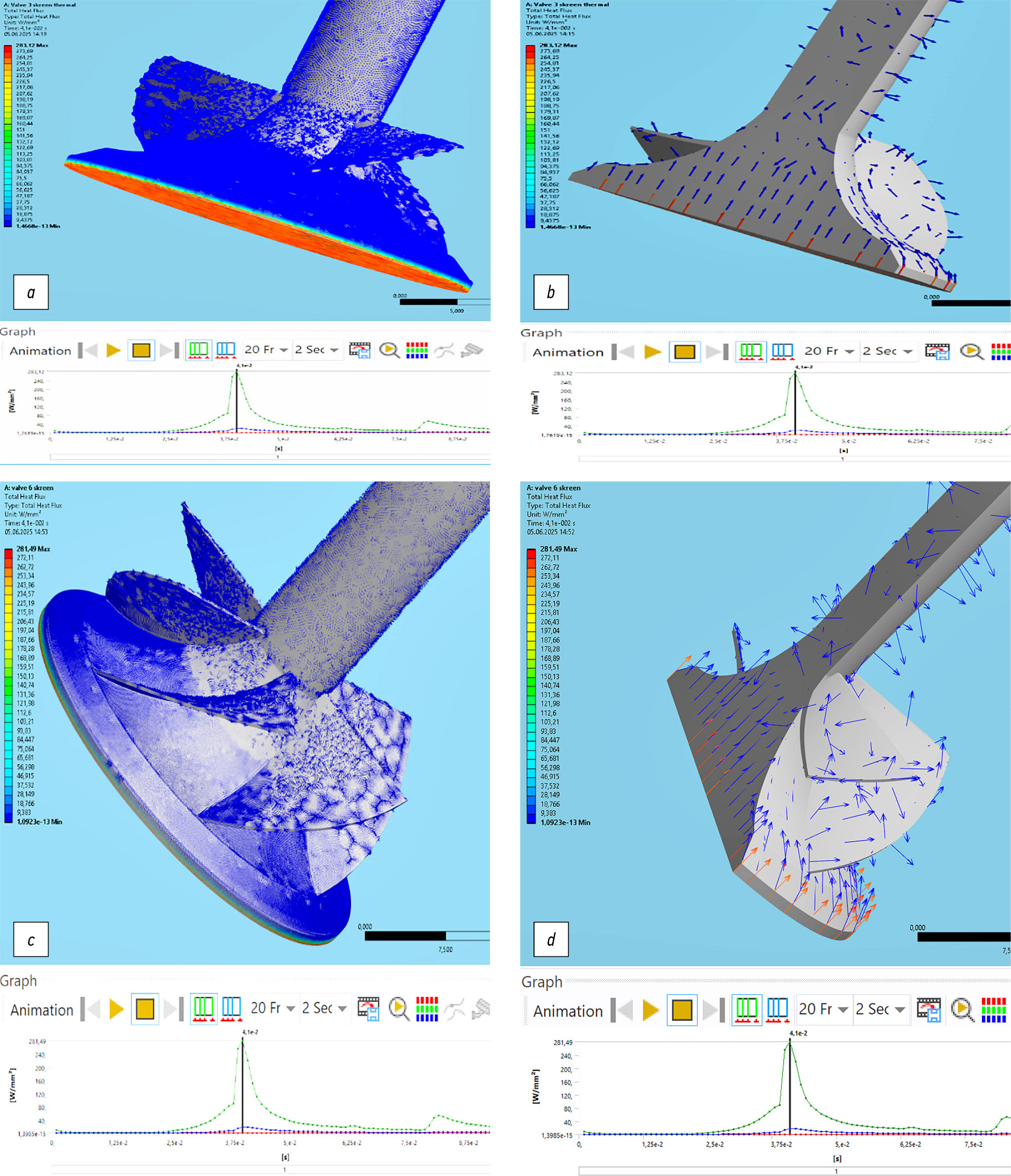 CONCLUSION: The simulation allowed to collect data on the temperature distribution inside valve trays of the studied 40X steel valves, which can be viewed at any time of the studied interval. The study of the heat flux in valves of different designs revealed that the heat flux increased in the valve with 3 blades (283.12 W/mm2) and the heat flux in the design with 6 blades was 281.49 W/mm2.