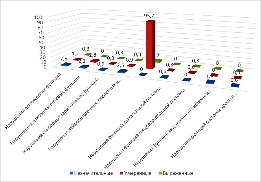В целом у детей, направленных на МСЭ, выявлены в 26,1 % – незначительные нарушения функций организма, 86,8 % – умеренные, в 4,3 % – выраженные.