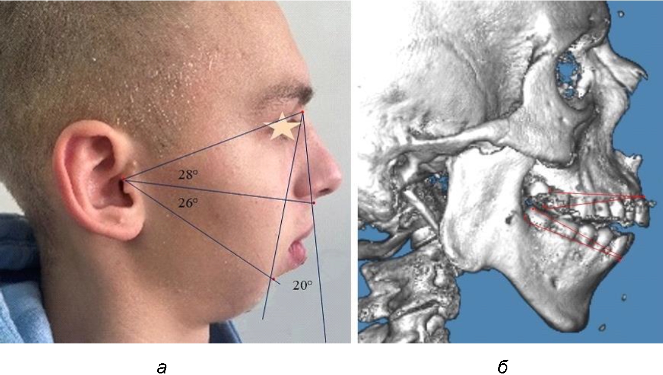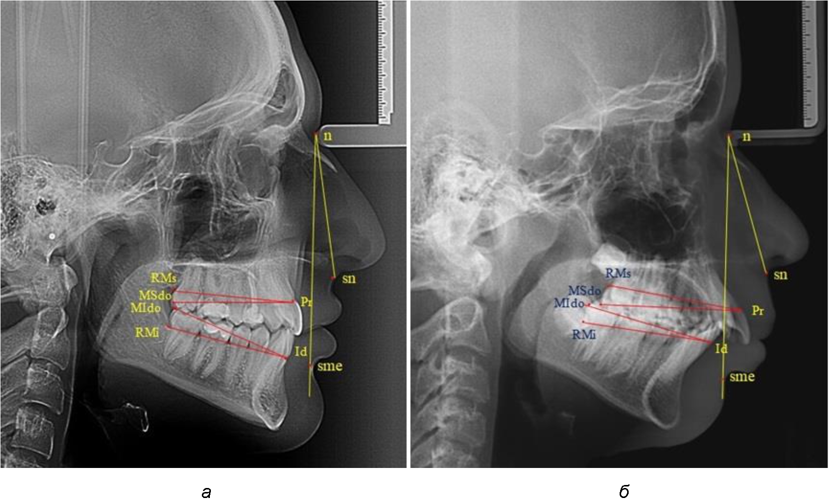 Рис. 2. Анализ фотоснимка (а) и рентгенограммы (б) при гнатической форме дистальной окклюзии