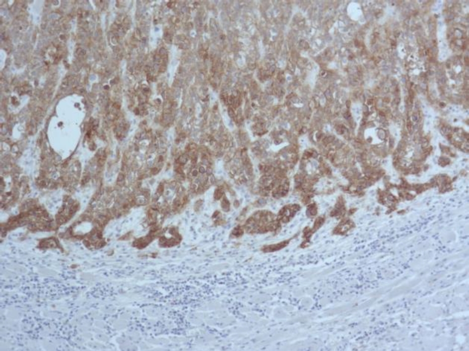 Рис. 3. Диффузная экспрессия EGFR в клетках плоскоклеточного рака языка. ИГХ окрашивание, ×100