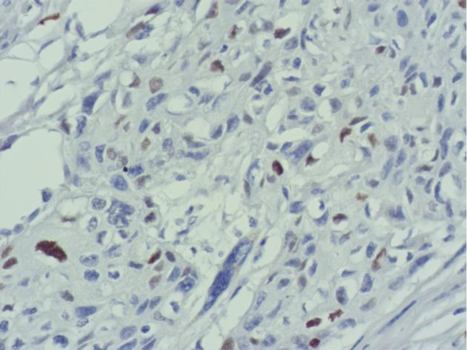 5. Fig. 4. Focal weak and moderate expression of Cyclin D1 in tongue squamous cell carcinoma cells. IHC staining, ×400