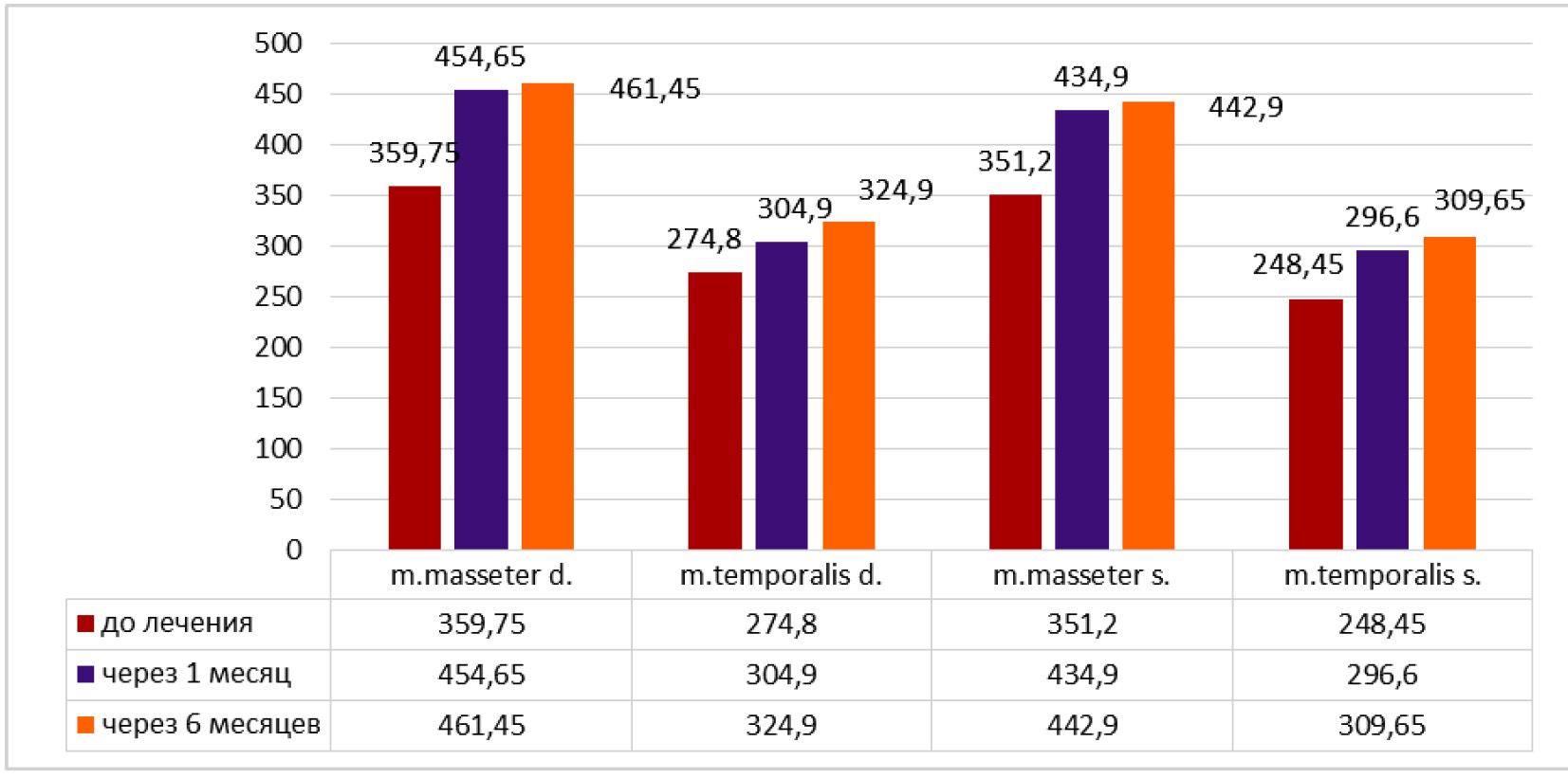 Через 1 месяц после лечения получили, что в основной группе средняя амплитуда электромиографии в мкВ составила: для правой стороны собственно жевательной мышцы 454,65 ± 2,50 и височной мышцы 304,9 ± 5,84; для левой стороны собственно жевательной мышцы 434,9 ± 5,84 и височной мышцы 296,65 ± 2,41. Через 1 месяц после лечения получили, что в контрольной группе средняя амплитуда электромиографии в мкВ составила: для правой стороны собственно жевательной мышцы 374,8 ± 10,42 и височной мышцы 291 ± 9,42; для левой стороны собственно жевательной мышцы 351,4 ± 12,24 и височной мышцы 273,1 ± 8,44 (при p < ,05).