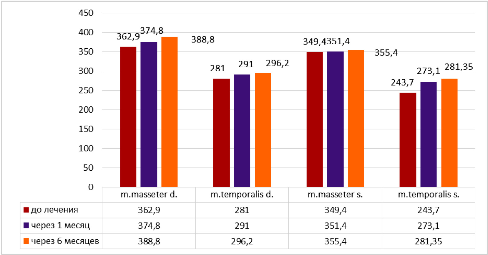 В основной группе показатели через 6 месяцев при максимальном сжатии челюстей средняя амплитуда электромиографии в мкВ составила: для правой стороны собственно жевательной мышцы 461,45 ± 4,5 и височной мышцы 324,9 ± 6,71; для левой стороны собственно жевательной мышцы 442,90 ± 7,91 и височной мышцы 309,65 ± 5,65.