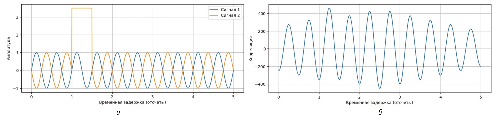 Рис. 2. а) Синусоидальные сигналы (сигнал 2 с импульсной помехой); б) График взаимной корреляции между сигналами с импульсной помехой
