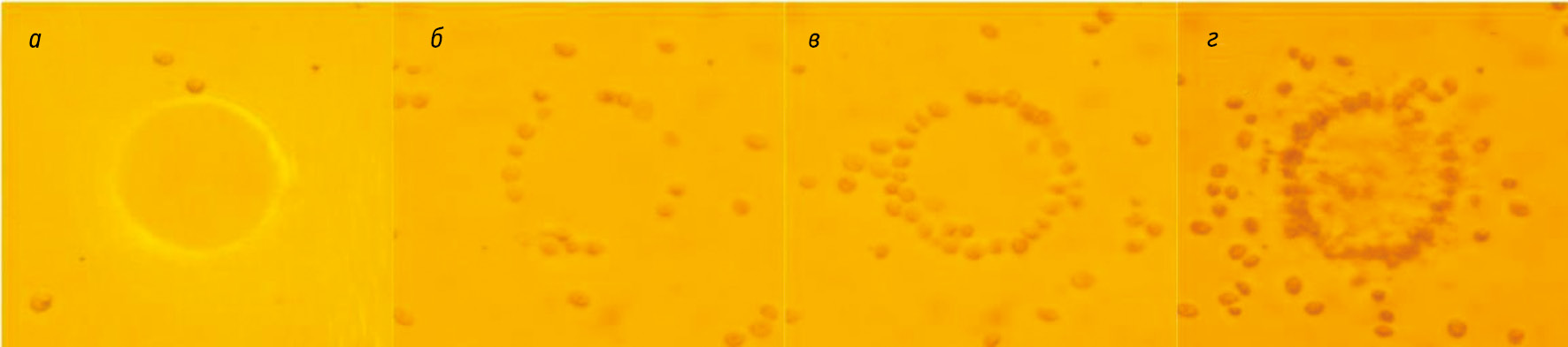 Рис. 2. Пример фиксации латексных микросфер с клетками kidney (а, б) и thyroid (в, г) в заданных конфигурациях