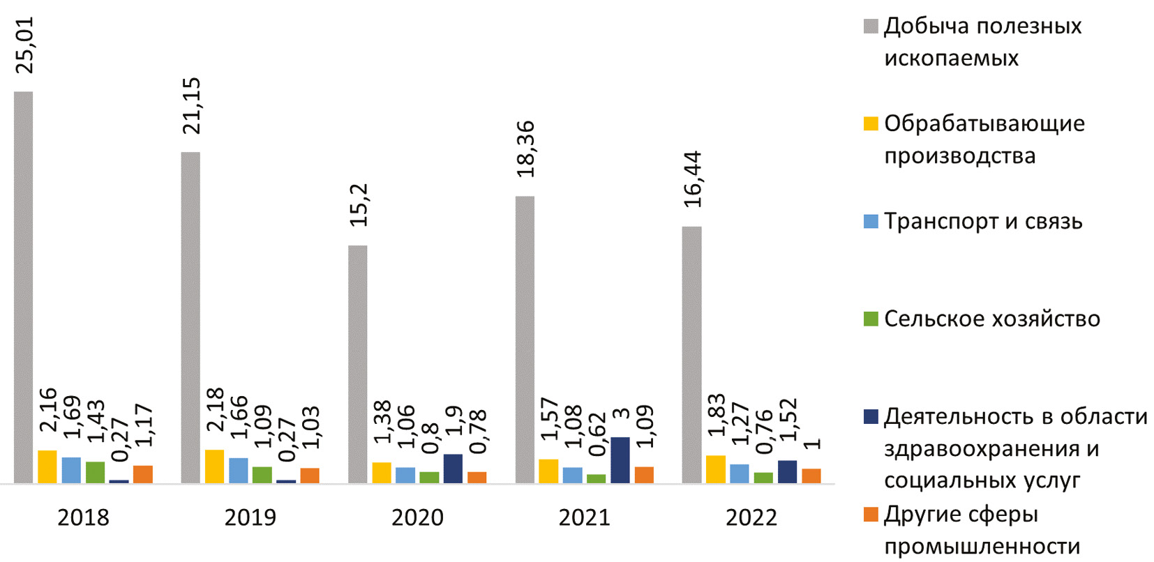 В ходе аналитического обзора мы рассмотрим изменения в показателях профессиональных заболеваний среди работников различных отраслей экономики на территории России за период с 2018 по 2022 год. Проценты будут рассчитаны на основе количества случаев на 10 тысяч трудоспособных граждан (рис. 1) [1].