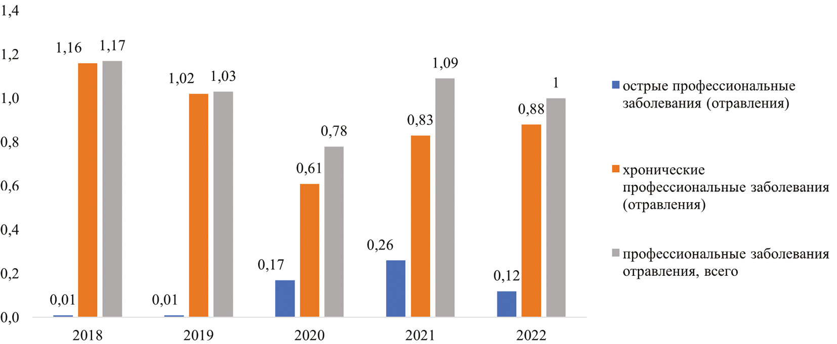 Исследование данных о заболеваемости работников позволяет прийти к пониманию, что за весь период, который был подвергнут анализу, как острые, так и хронические заболевания, связанные с профессией, сохраняют высокие показатели и лишь немного уменьшаются к 2022 году.