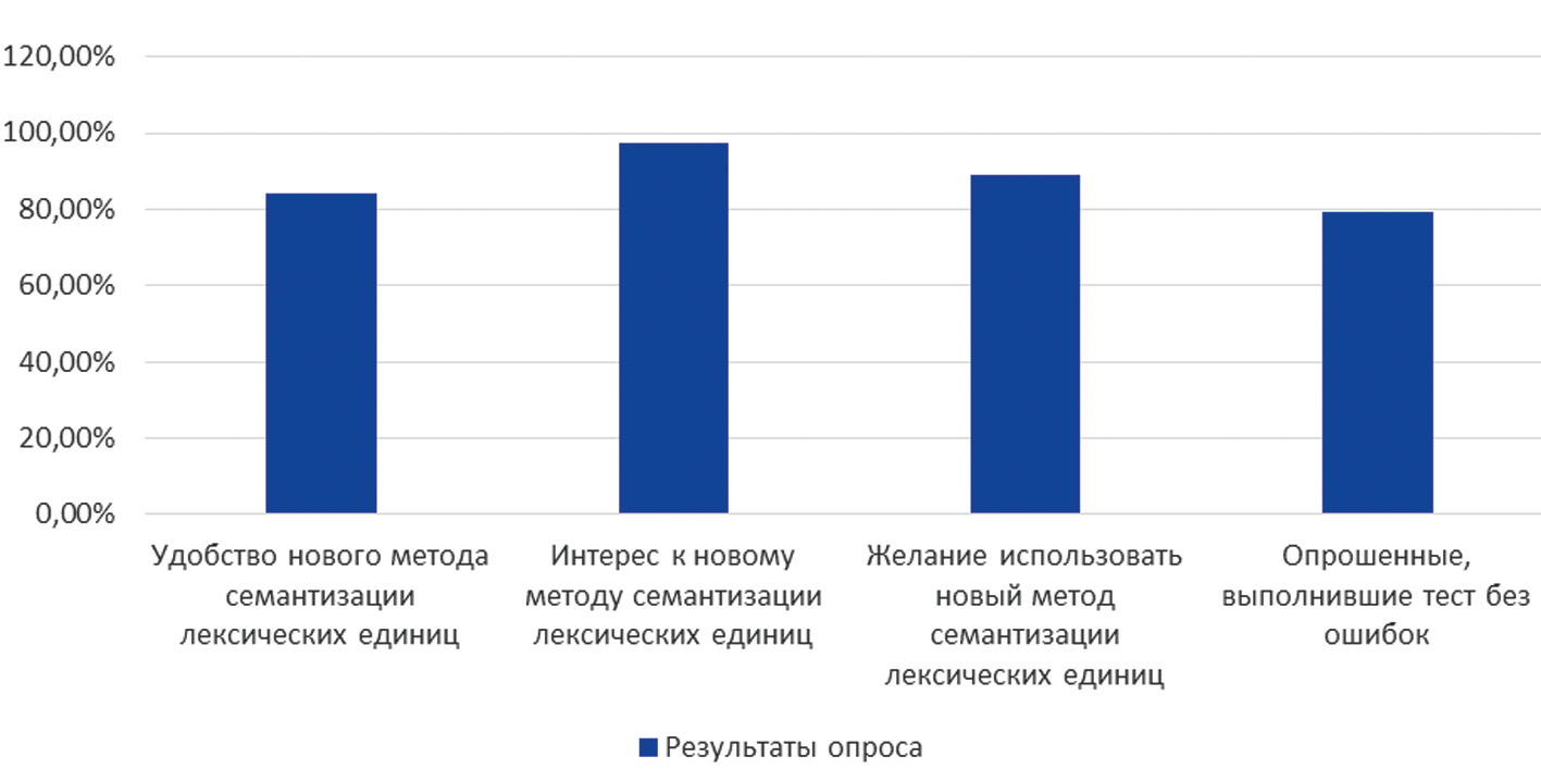 Результаты проведенного исследования (рис. 1) позволяют нам сделать вывод о том, что такой вариант подачи лексики интересен обучающимся, они замотивированы изучать новые сова и выражения. Результаты тестирования показывают закрепление в памяти новых лексических единиц и их значения, может быть, даже более детального и узкого, чем при переводном способе семантизации.