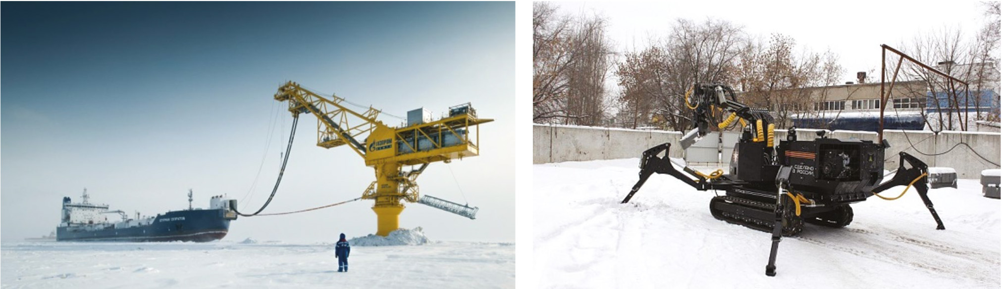 Несмотря на эффективность указанных методов, их применение ограничено необходимостью индивидуальной адаптации к климатическим параметрам конкретного региона. Например, алюминиевые сплавы, устойчивые к хрупкости, могут не подходить для условий высокой влажности, что требует дополнительных исследований в области гибридных покрытий. Тем не менее комбинация хладостойких материалов, термостабилизации и антикоррозийной защиты позволяет достичь требуемых характеристик, как продемонстрировано в проектах «Ворота Арктики» (нефтеотгрузочный терминал) и «РОИН Р-300» (робототехнический комплекс) — рис. 2.