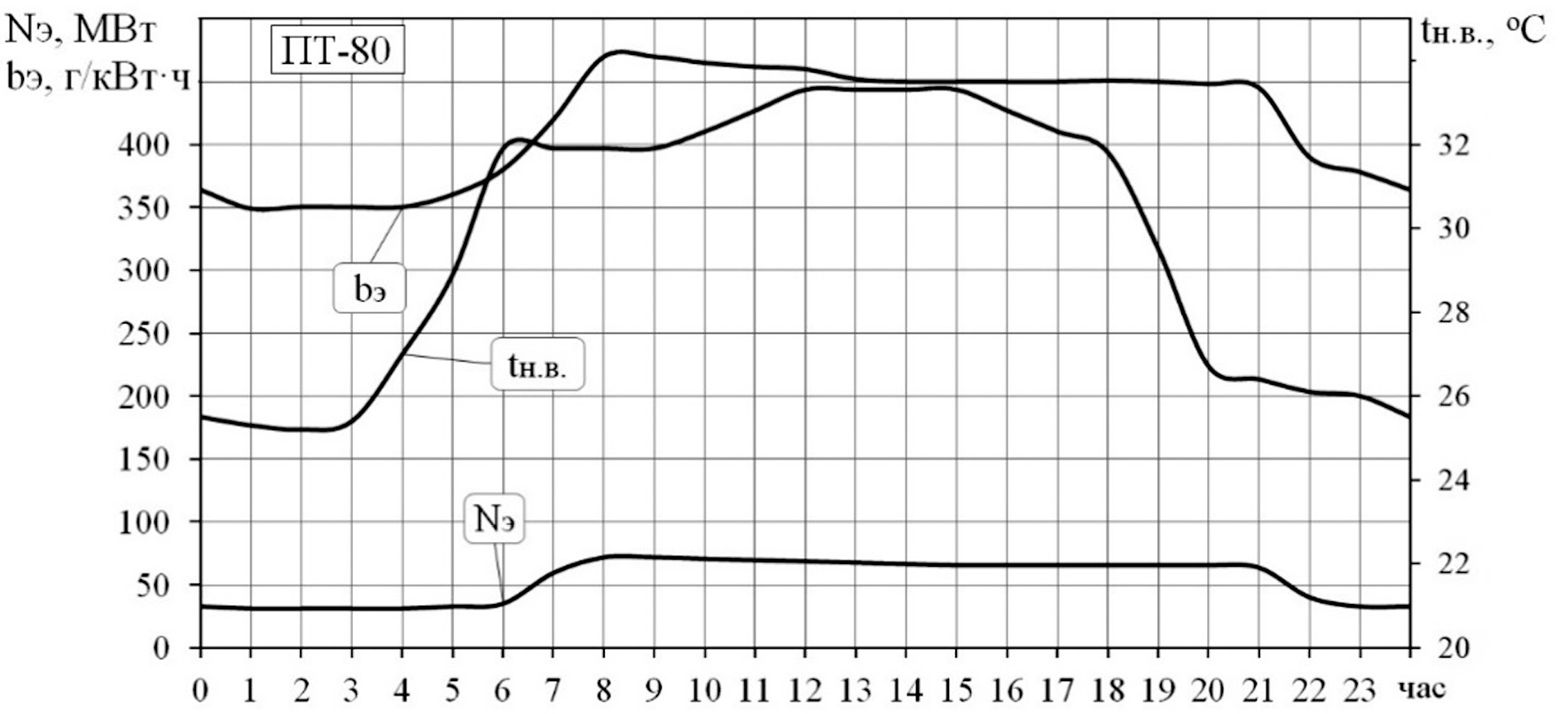 Рис. 1. Изменение электрической мощности Nэ, удельного расхода условного топлива bэ и температуры наружного воздуха tн.в за сутки в межотопительный период для наиболее неблагоприятного (теплого) времени года