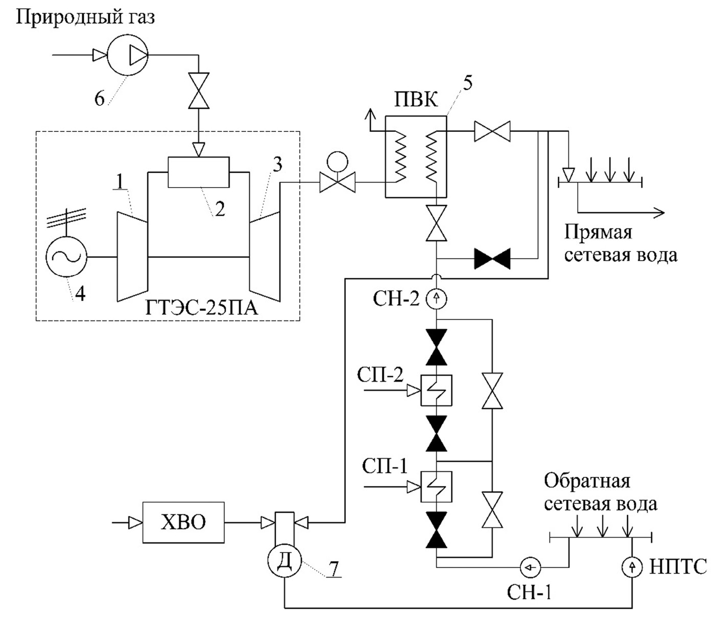 Предложенная схема модернизации ТЭЦ (рис. 2), предусматривающая установку двух газотурбинных энергоустановок ГТЭС-25ПА производства АО «ОДК-Авиадвигатель» [2] при наличии в пиковой котельной двух водогрейных котлов КВ-ГМ-180, позволяет полностью покрыть тепловую нагрузку на горячее водоснабжение (ГВС) в межотопительный период исключительно в утилизационном режиме, без дополнительного сжигания топлива [3].