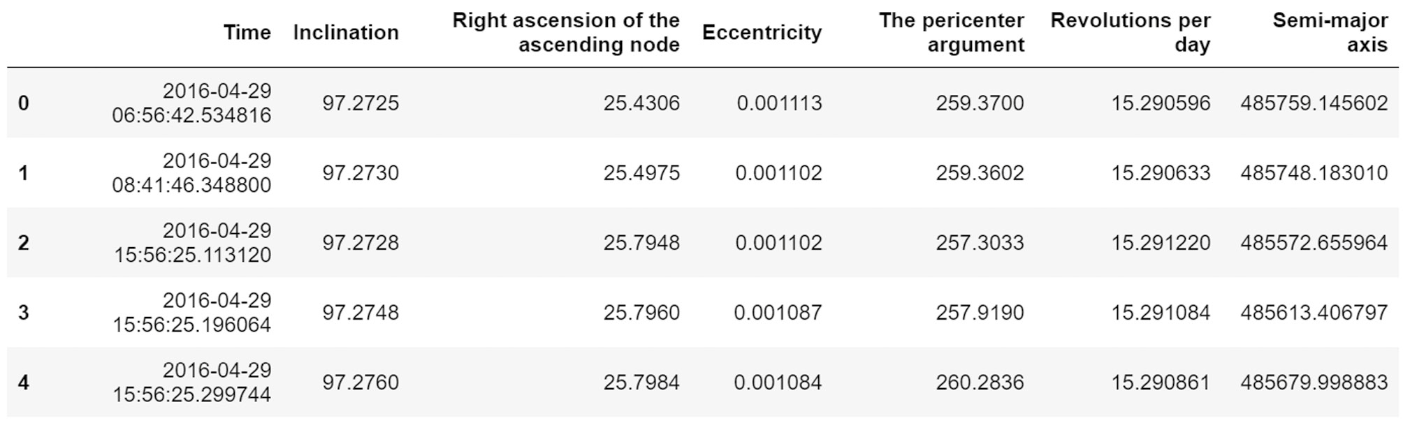 Методы. Для эффективного управления орбитальным движением и прогнозирования положения спутника необходимо иметь точные данные о его траектории и параметрах орбиты. Для определения эволюции орбиты КА используются навигационные данные в формате TLE, которые содержат в себе следующие орбитальные параметры спутника:
