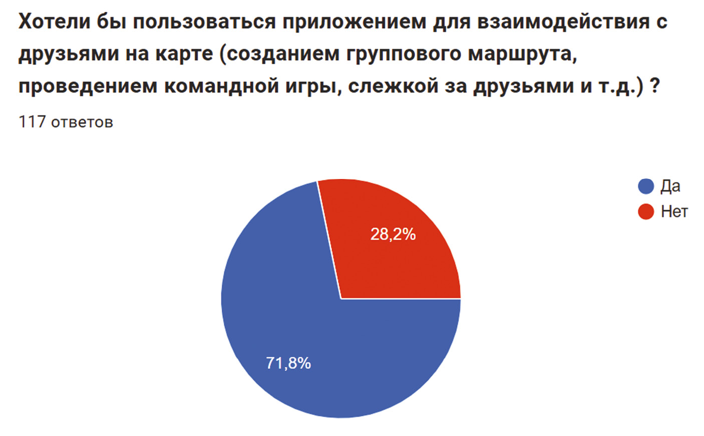 Обоснование. В настоящее время в туризме, спорте и активном отдыхе можно наблюдать рост интереса к командным путешествиям, походам, квестам и другим формам групповой активности. Однако существующие навигационные сервисы (Google Maps, Яндекс.Карты и др.) не всегда удобны для совместного использования группой, что создает потребность в специализированных решениях. По результатам проведенного опроса (рис. 1), 71,8 % респондентов заинтересованы в использовании мобильного приложения для взаимодействия группы на карте.