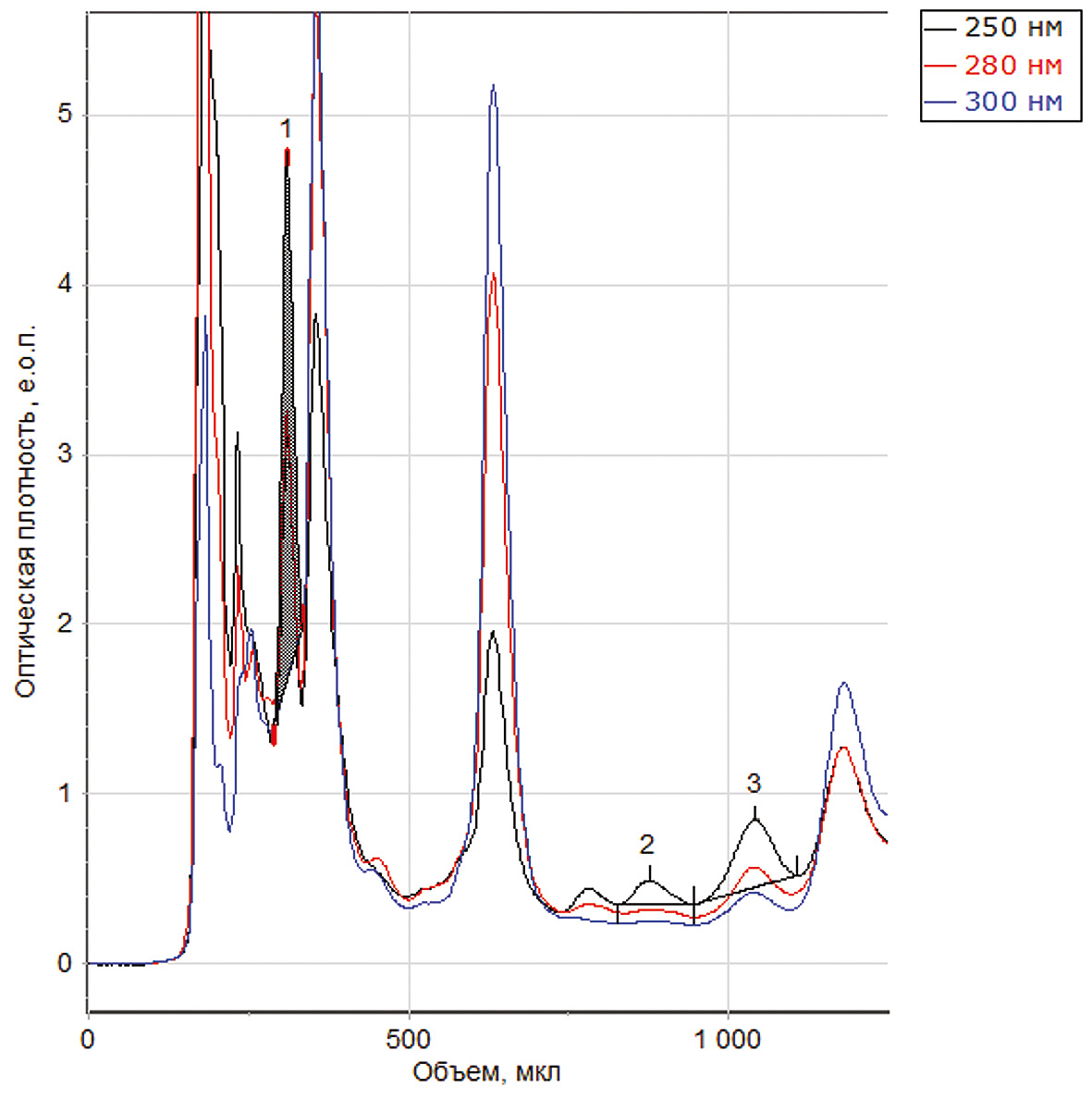 Рис. 2. Хроматограмма разделения экстракта ромашки с ИЖ [C6MIM][BF4]: подвижная фаза ацетонитрил/вода (15/85 об.%, 0,1 % ТФУ): 1 — хлорогеновая кислота; 2 — рутин; 3 — цинарозид