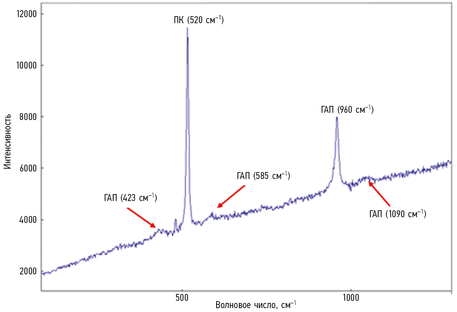 Рис. 1. Рамановская спектроскопия порошка нанокомпозита ПК+ГАП