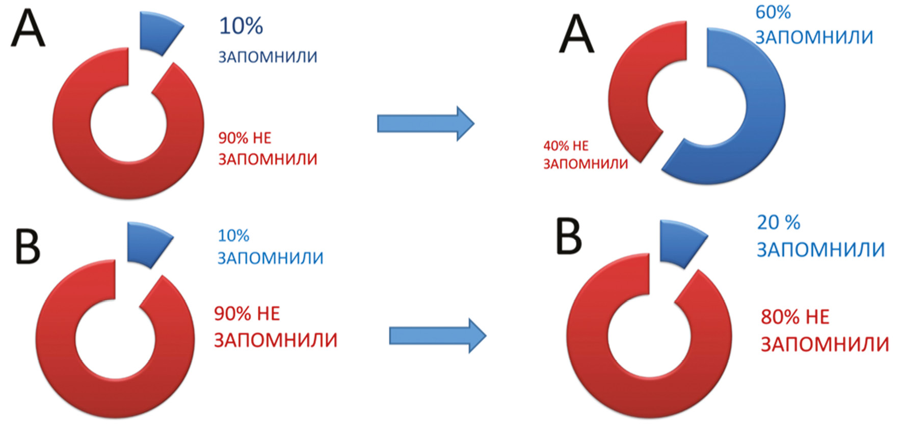 • улучшение усвоения материала: в контрольной группе, использующей арт-технологии, процент запоминания иероглифов увеличился с 10 до 60 %, в то время как в контрольной группе без арт-технологий этот показатель увеличился только на 10 % (см. рис. 1).