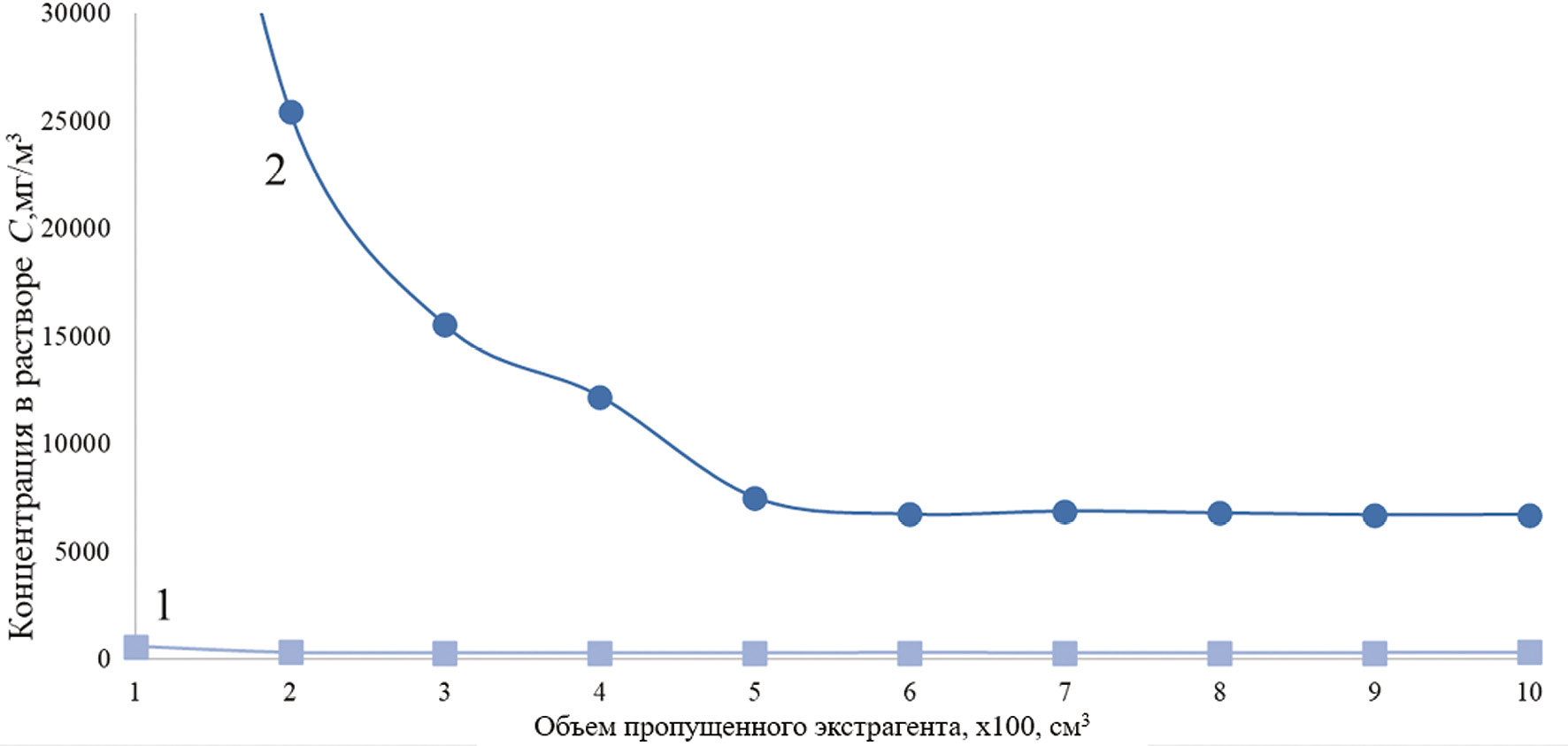 Результаты. На рис. 1 представлен сводный график зависимости содержания пентадекановой кислоты в н-октане от цикла динамической экстракции при температуре 50 °C при исследовании систем на основе эпоксидной (1) полиэфирной (2) смолы. Анализ графика зависимости позволяет заключить, что полиэфирные матрицы обеспечивают существенно более высокую концентрацию аналита в экстрактах.