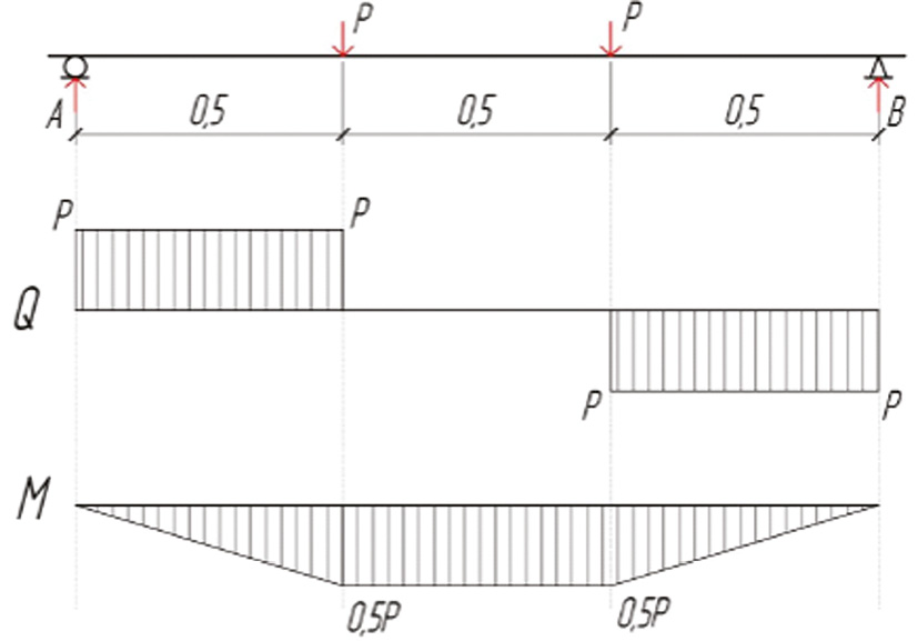 Были проведены испытания на установке, где тестировалась балка с пролетом 1,5 м. Балка подвергалась симметричной нагрузке, которая была приложена парой сил на расстоянии 0,5 м от опор (рис. 1).