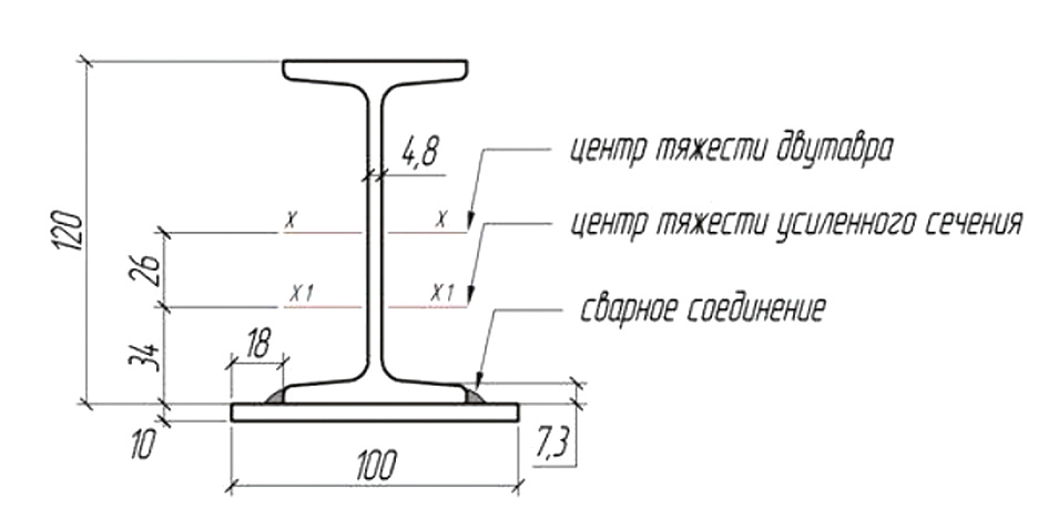 Рис. 2. Усиленный двутавр с приваренной полосой к нижней части балки