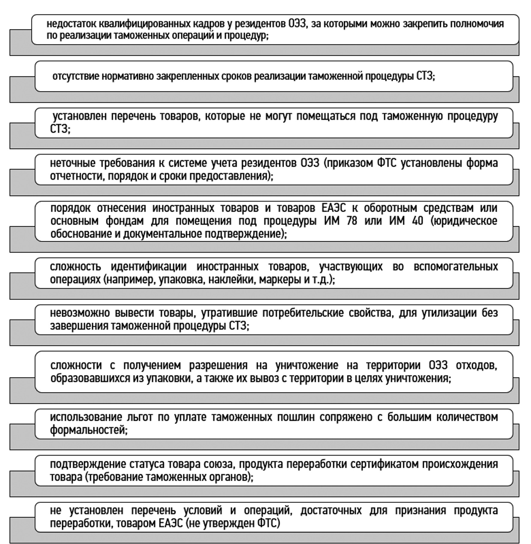 Выводы. Создание и функционирование ОЭЗ положительно влияет на развитие экономики региона. Во многом это обусловлено применением на этих территориях резидентами таможенной процедуры свободной таможенной зоны. Но реализация таможенных операций резидентами ОЭЗ сопряжена с комплексом проблем, источником которых являются недостаточная проработка правовых норм, неготовность резидентов к соблюдению установленных формальностей и ряд других причин. Устранение узких мест при реализации резидентами таможенных формальностей позволит повысить эффективность функционирования ОЭЗ в РФ.