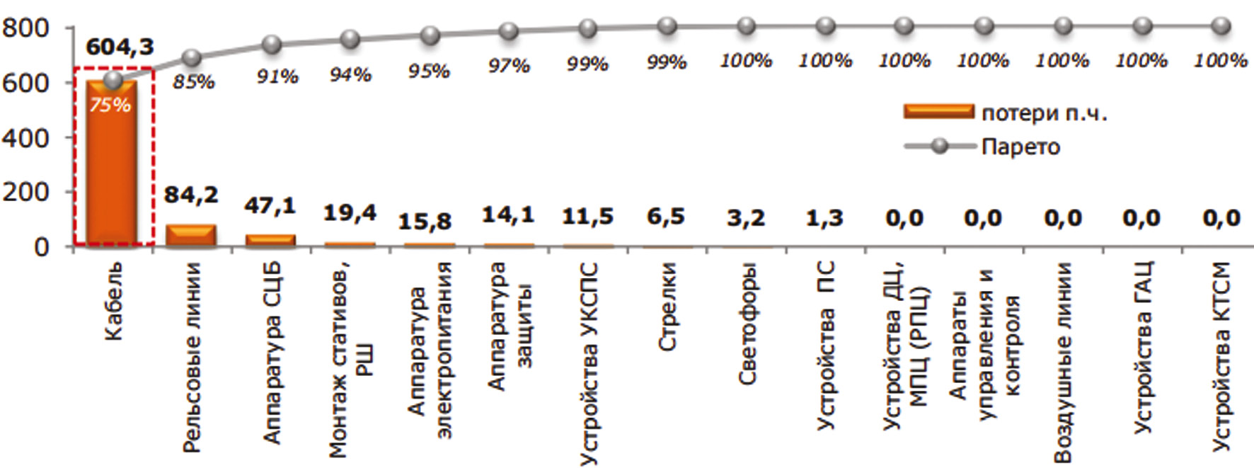 Рис. 2. Распределение Парето потерь поездо-часов от отказов вида «эксплуатационный»
